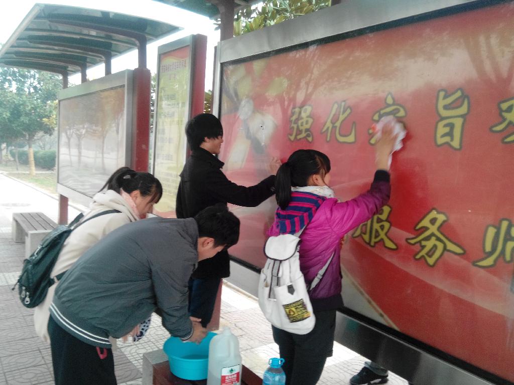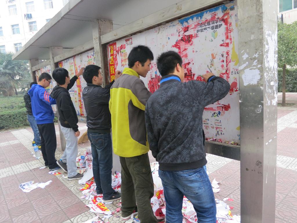 上午八时许,参加本次义务劳动的学生在中心广场准时集合,分为三组,有序的开始了清除工作。分别对教学区、生活区和图书馆区域的宣传栏、广告牌、校车站牌等处进行了彻底的清除。三组同学分工合作,齐心协力完成了清除任务,两个小时后所见之处焕然一新,清理工作顺利完成。