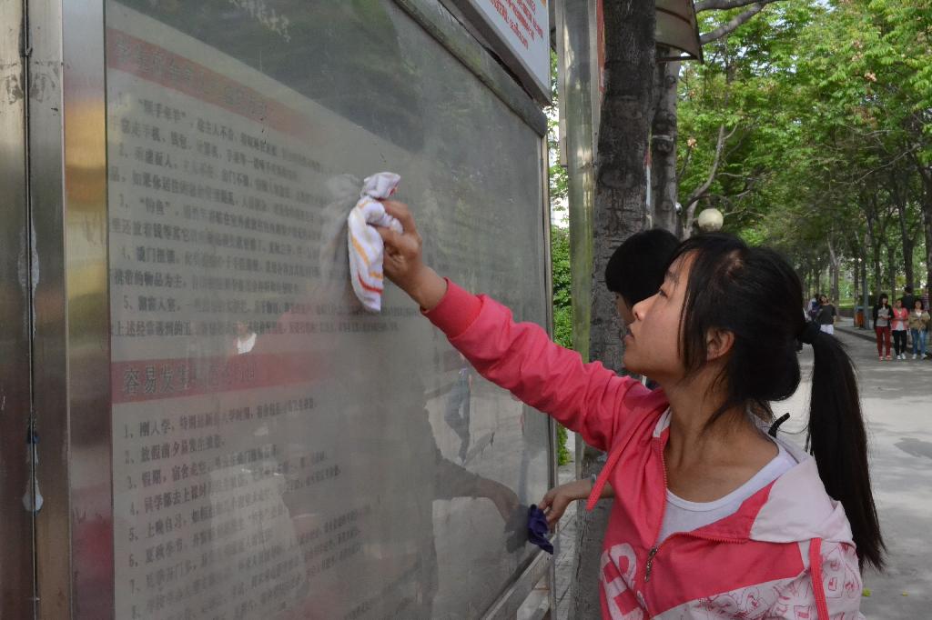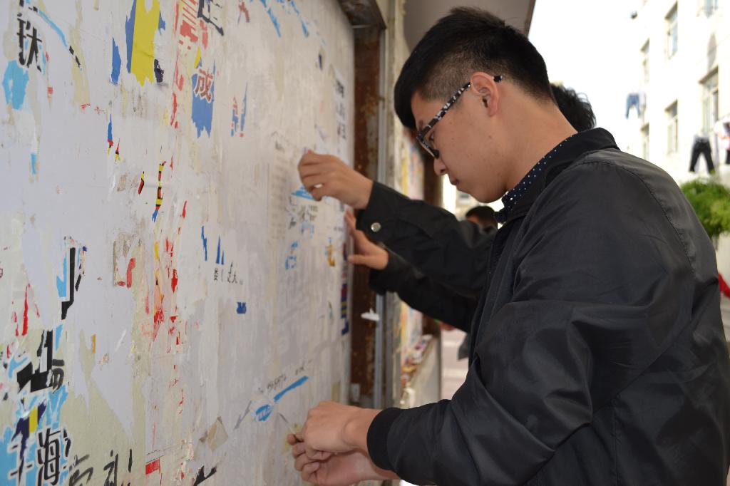 下午四点,参加义务劳动的同学在骊秀园门口准时集合,在资助部干事的有序组织下,同学们分成四小组,分别在骊秀园门口、一号宿舍楼前、图书馆两侧分区域清理小广告。同学们认真仔细地用抹布,小刀把墙上广告栏内的各种小广告在最短的时间内一点点刮干净,使广告栏变得干净明亮。