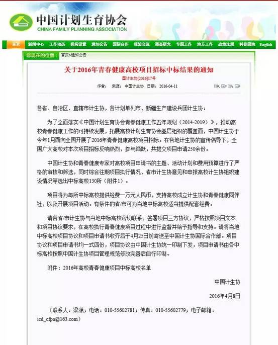 近日,中国计划生育协会公布了2016年青春健康高校项目的中标高校名单。经过市、省、国家三级计划生育协会的严格审核、筛选,最终滚球官网分团委组织申报的“青春健康不任‘性’”项目成功中标,成为陕西省高校项目中标的9所高校之一。