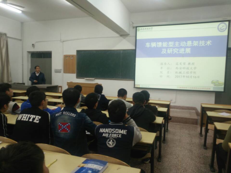 学院副院长寇发荣教授应邀作了题为《车辆馈能型主动悬架技术及研究进展》报告,寇院长从振动控制技术概述、馈能悬架研究意义、国内外研究现状、本课题组研究情况和总结与展望等几个方面做了阐述和介绍。整场报告内容丰富,精彩纷呈,通过本次讲座使同学对车辆悬架技术有了一定的了解,扩大了学生的知识面。