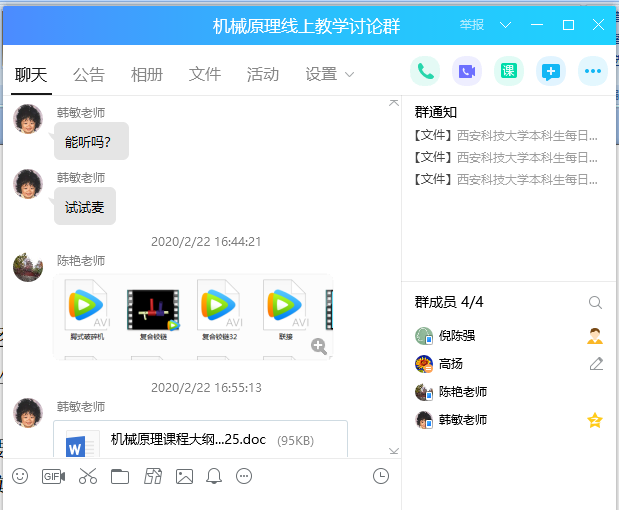 在网络授课准备过程中,教师们以在线培训为主要形式,选超星、学堂在线等线上优质教师教学发展课程资源与名师名家在线讲座,从教学实践、教学方法、教学设计、在线教学技能等方面对自己进行信息化教学能力提升培训。尝试主流在线教学软件,进行平台了解及测试,尽力确保教学质量。除了系部群外,各个课程组均成立了讨论小组,有问题及时交流及解决。