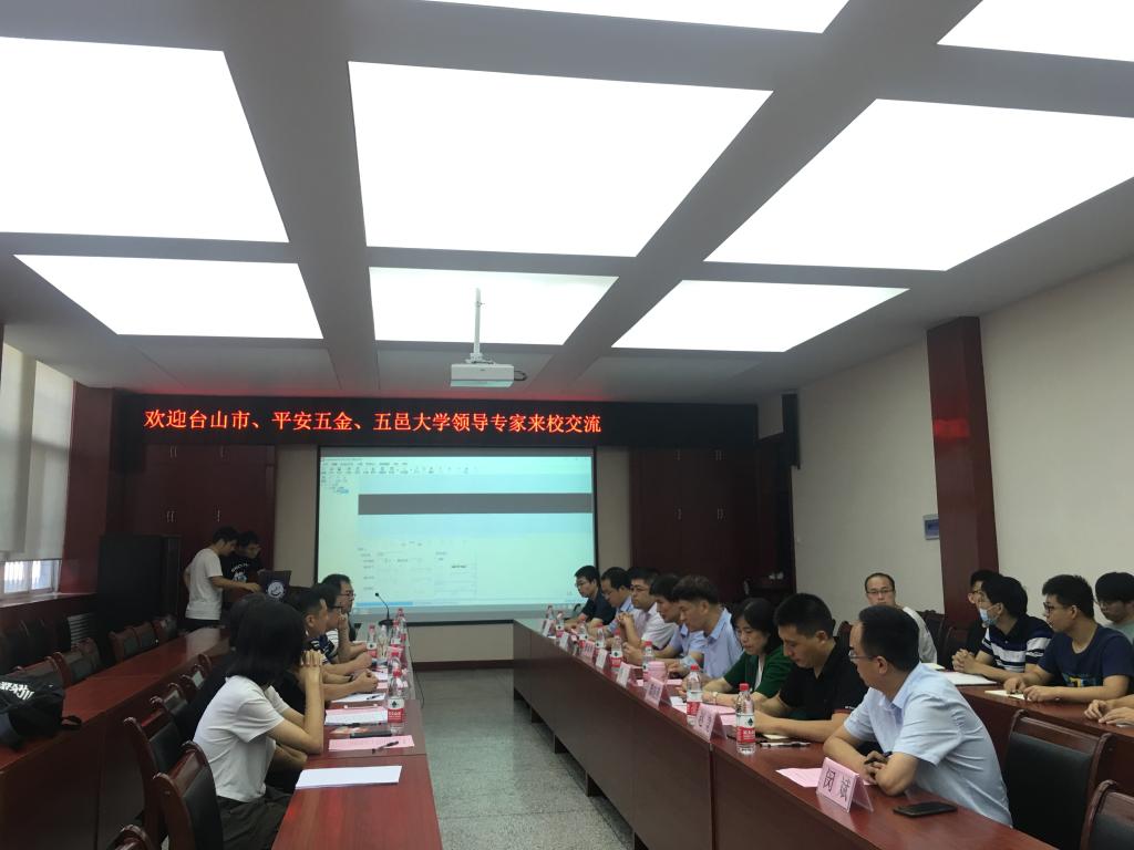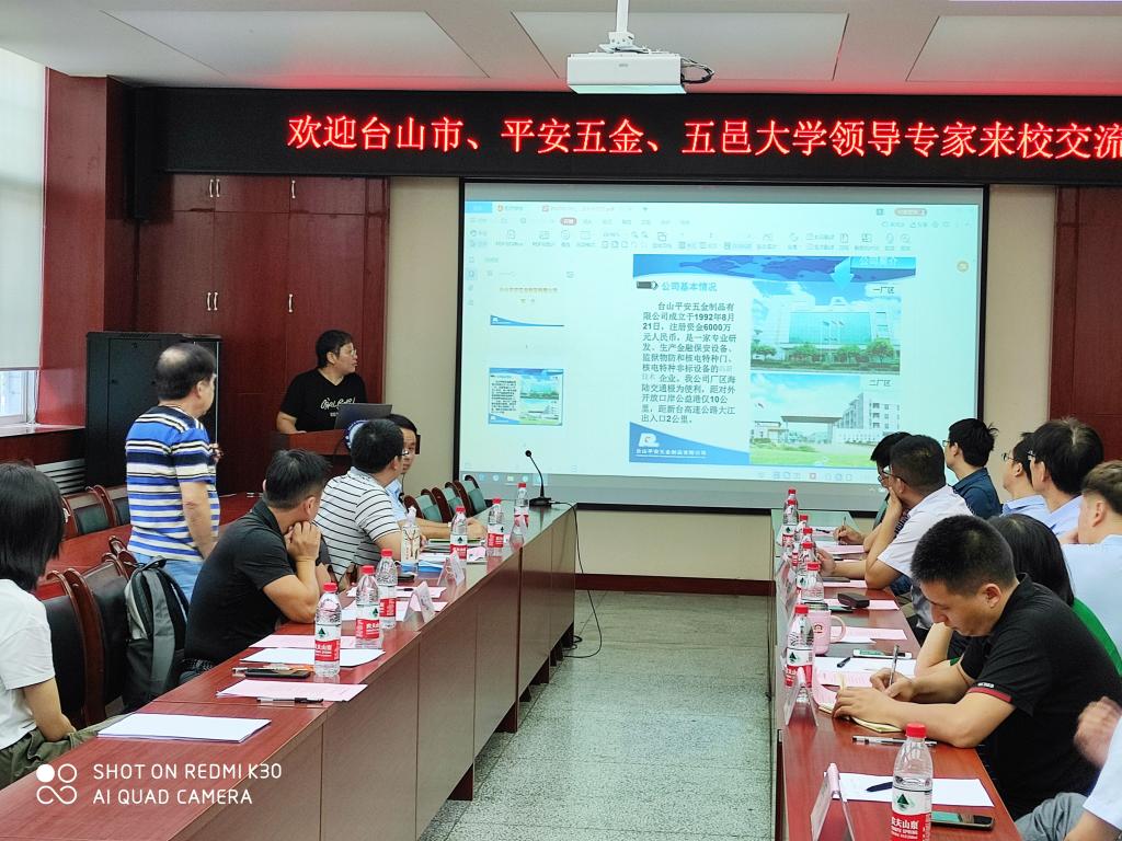 张金来首先致欢迎辞,并介绍了学院的历史沿革和概况。寇发荣介绍了参会人员和学院教学、科研、人才培养、学科建设等方面情况。苏惠武介绍了台山市及企业人才需求情况,蔡志伟介绍了平安五金制品有限公司的产品生产和技术合作意向。与会人员就校企合作方面关注的问题进行了深入地交流。