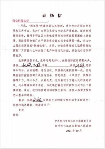 2021月7月底,“德尔塔”病毒突袭江苏扬州,对广大群众生命安全造成严重威胁。滚球买球的app官网滚球买球的app官网机械电子工程2021级学生刘超不畏艰险,勇于担当,在经过疫苗注射和核酸检测后加入了首批抗疫志愿者队伍,并担任组长,积极奋战在抗疫第一线,协助医疗人员进行全市核酸检测工作,与交警维持卡口交通管制等,与其他志愿者齐心协力共同筑起疫情防控“铜墙铁壁”,为当地疫情防控做出贡献,受到******************扬州邗江区方巷镇委员会的高度评价与肯定。