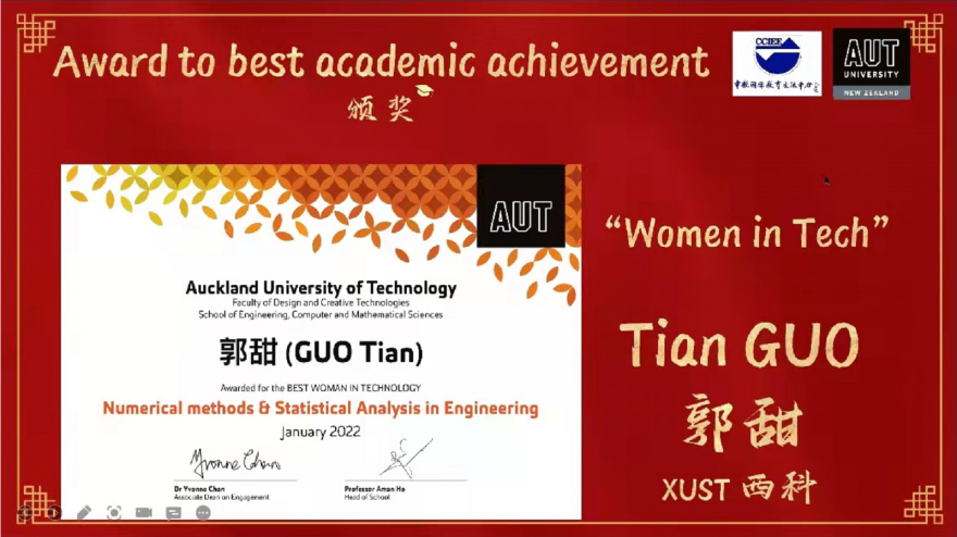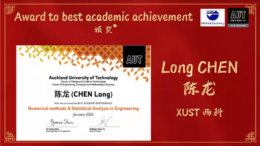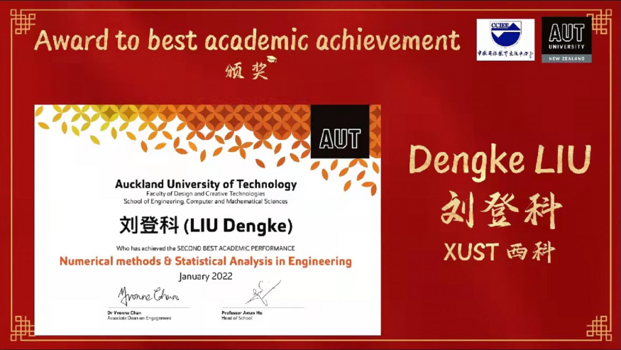 《Numerical Method & Statistical Analysis in Engineering》课程由奥克兰理工大学David Wilson教授主讲,滚球买球的app官网赵江滨博士任助教。在为期12周的教学活动中,滚球买球的app官网选修该课程的27名研究生表现突出,全员通过课程考核,其中陈龙、刘登科、郭甜三名研究生凭借优异的成绩排名分别荣获该课程设立的三个奖项“The Best Academic Performance” “The Second Best Academic Performance”和“The Best Woman In Technology”奖项。