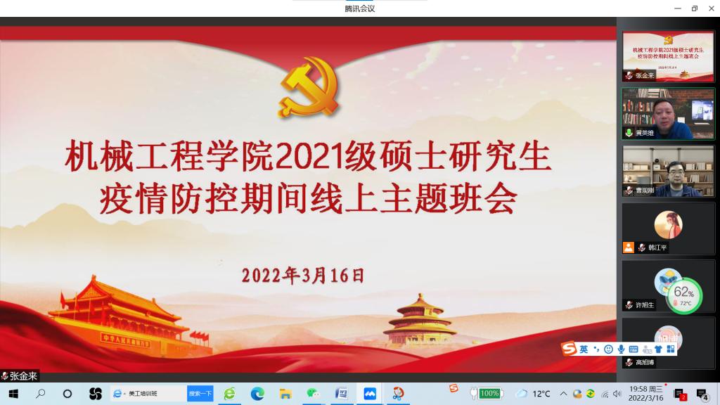 主题班会上,研究生辅导员通报了近期疫情防控的形势,传达了学校近期疫情防控和日常教育管理的相关要求;领学了《滚球买球的app官网新冠疫情防控期间学生管理暂行规定》。曹现刚副院长围绕各年级研究生开题、预答辩、发明专利、论文发表、科技竞赛以及就业签约等情况,通过数据分析对比,指出研究生学习中存在的问题和不足并提出中肯的意见和建议,要求大家时刻紧绷疫情防控思想弦,充分发挥主观能动性,养成自律严格的学习生活习惯,进一步端正科研态度,积极参与到导师团队科学研究活动,集中精力狠抓学位论文质量,努力提升自己的创新能力和水平,充分发挥科研主力军作用。张金来书记在主题班会上要求大家始终保持头脑清醒,正确认识当前防控的严峻形势,积极配合做好疫情防控的各项要求,勇担时代重任,静心完成学业,身体力行大力弘扬伟大抗疫精神,用实际行动助力打赢疫情防控阻击战。黄英维副校长为学院师生鼓劲加油,勉励大家越是非常时期越要严格要求自己,增强责任担当,强化思想自觉,在认真完成科研学习,配合做好疫情防控的同时保护好、照顾好自己,以实际行动共同战胜疫情。