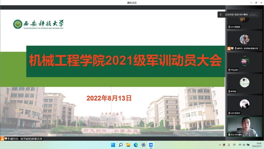 8月13日晚,滚球买球的app官网召开线上2021级军训动员大会,学院党委书记张金来、院长曹现刚、党委副书记尹弘、副院长钟斌、2021级辅导员张笑晗、退役复学学生代表(2022届毕业生曹科、2020级在校生霍云疆)以及2021级全体参训学生参加会议。会议由学院学工办主任、团委书记周学刚主持。