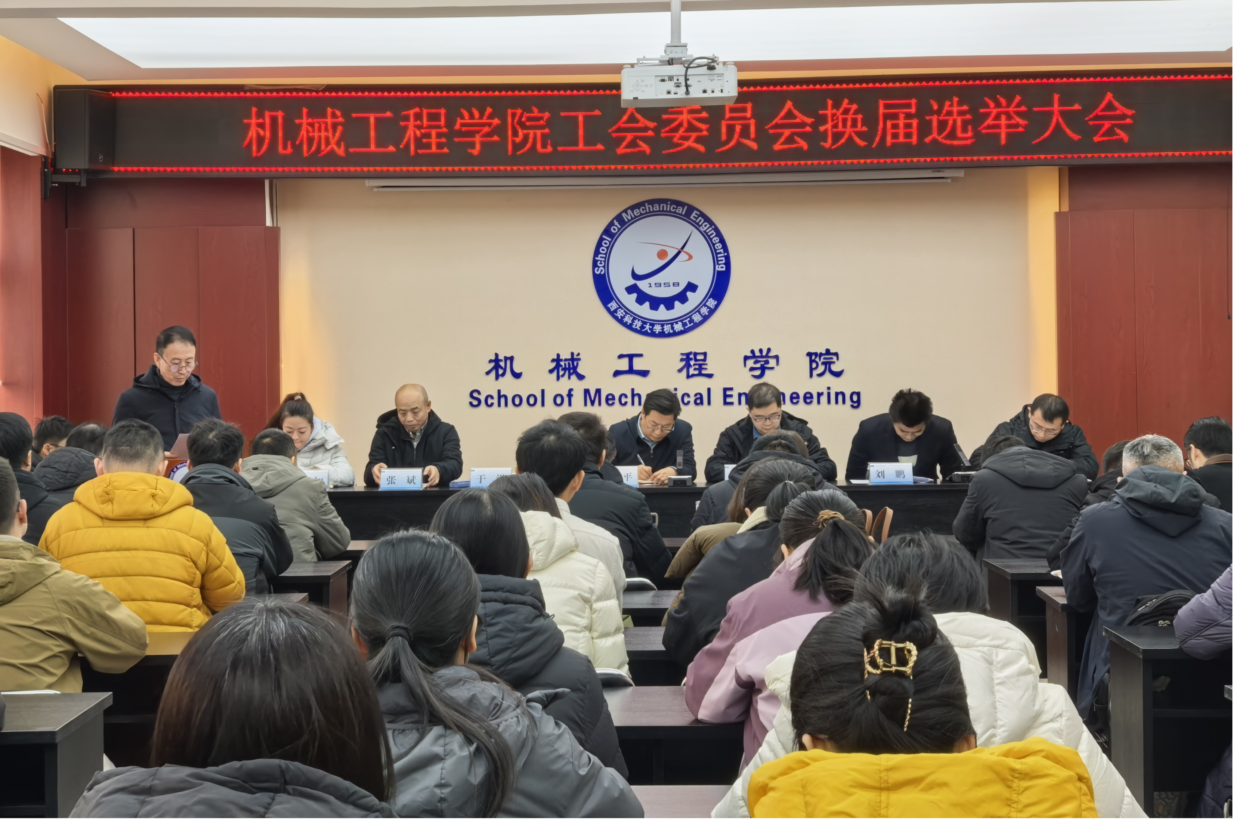 12月30日下午,机械工程学院在临潼校区320会议室召开学院工会会员大会,进行工会委员换届选举。学院党委书记郭小平,党委副书记、院长曹现刚,党委副书记、纪委书记尹弘,副院长赵栓峰、毛清华、钟斌,工会主席于洋、副主席刘鹏,工会委员张斌、吕叻加、韩江平,以及工会会员共计86人参加会议。会议由刘鹏主持。大会在庄严的国歌声中拉开帷幕。