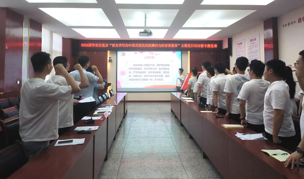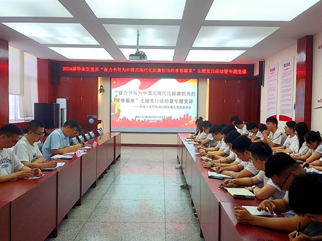 为深入学习贯彻党的二十大精神和习近平新时代中国特色社会主义思想,扎实推进党纪学习教育,进一步强化滚球官网毕业生党员的党性修养,引导学生党员牢记身份、发挥先锋模范作用。6月21日下午,滚球买球的app官网在雁塔校区机械楼210会议室召开“奋力书写为中国式现代化挺膺担当的青春篇章”2024届毕业生党员主题党日活动暨党纪学习教育专题党课。学院党委书记郭小平、副院长赵栓峰以及2024届硕、博士毕业生党员参加。支部书记张富强主持活动。