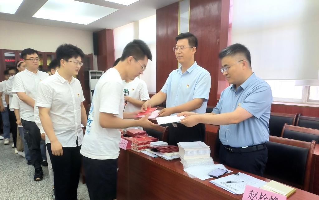 活动中,郭小平和赵栓峰分别为毕业班党员赠送《党章》和纪念卡等。