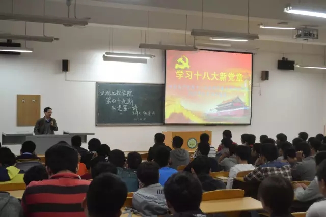 杨老师以"学习十八大新党章"为主题,分别从党员、党的组织制度、党的中央组织、党的地方组织、党的基层组织、党的干部、党的纪律、党的纪律检查机关、党组、党和共青团的关系这十个方面分别进行了阐述。