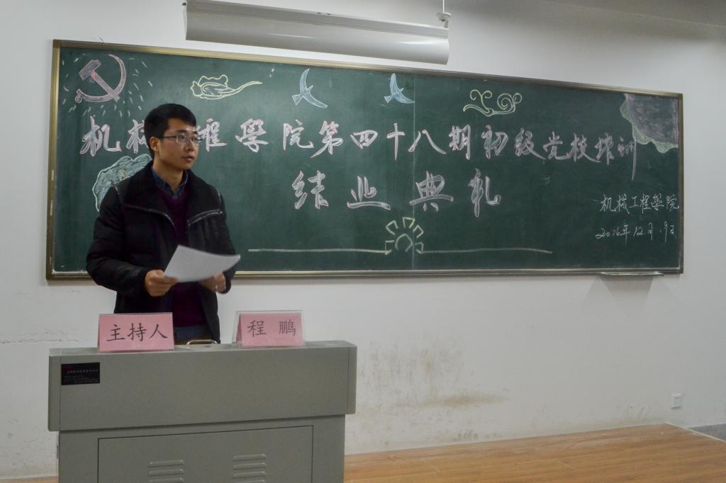 典礼由程鹏老师主持,在《国际歌》中拉开序幕,首先,程鹏老师通报了第四十八期初级党校的培训以及结业情况,经过理论授课,自学讨论,日常考核,结业考试等环节,共记五讲,十个课时,104人顺利结业,评选出5名优秀学员。然后,由辅导员老师们为本次初级党校结业学员代表颁发结业证书,党委副书记李婉丽老师为优秀学员颁发荣誉证书。最后,李婉丽老师发表了讲话,对顺利结业的同学表示了祝贺,对第四十八期党校的组织和授课老师表示了感谢,同时向全体学员提出了希望:初党只是组织发展的第一步,学员应发挥模范带头作用,深刻认识学习马克思主义,不断提高自身的党性修养,为早日加入中国共产党做好充分准备。