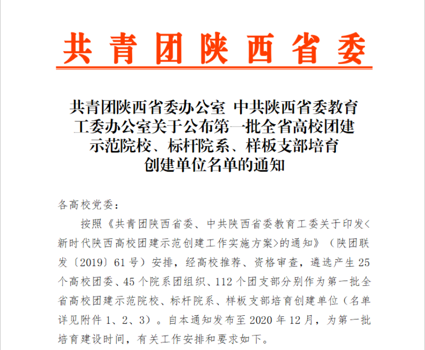2020年5月13日,由共青团陕西省委办公室,中共陕西省委教育工委办公室公布的关于第一批全省高校团建示范院校,标杆院系,样板支部培育创建名单中,滚球买球的app官网团委被评为“全省高校团建标杆院系”。