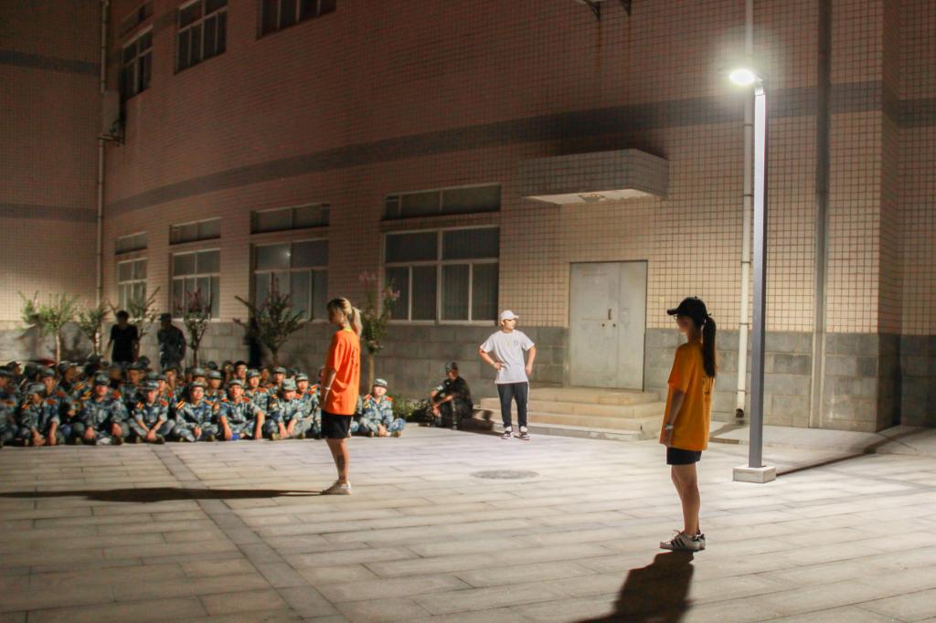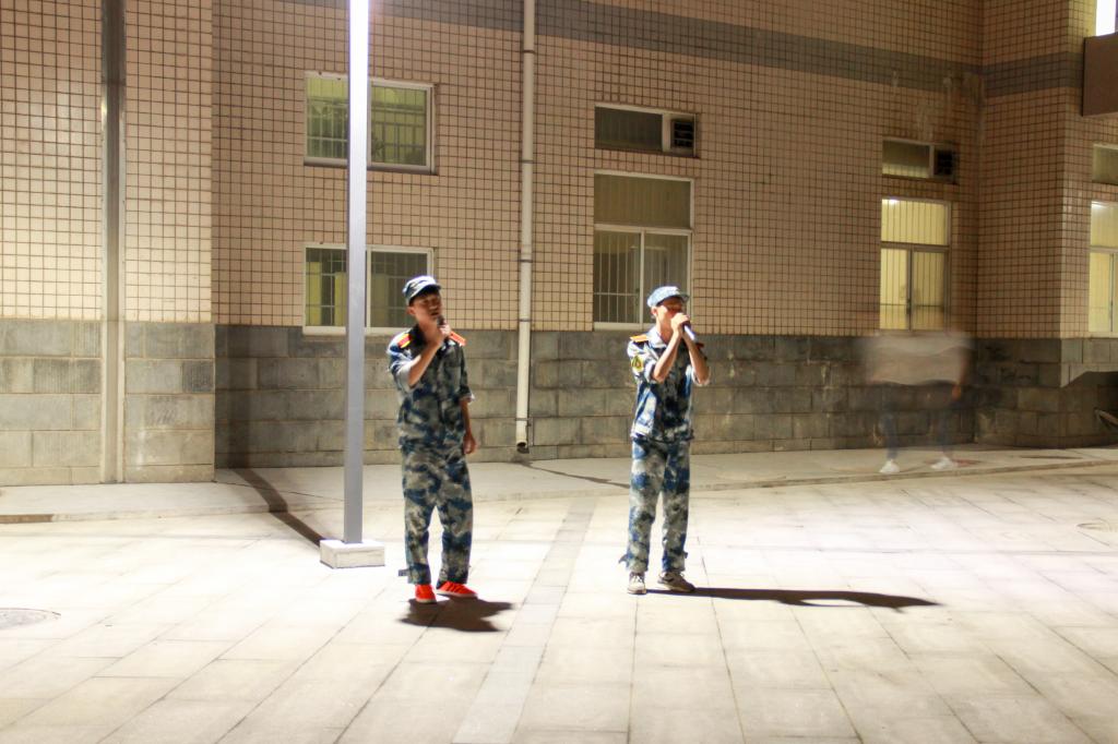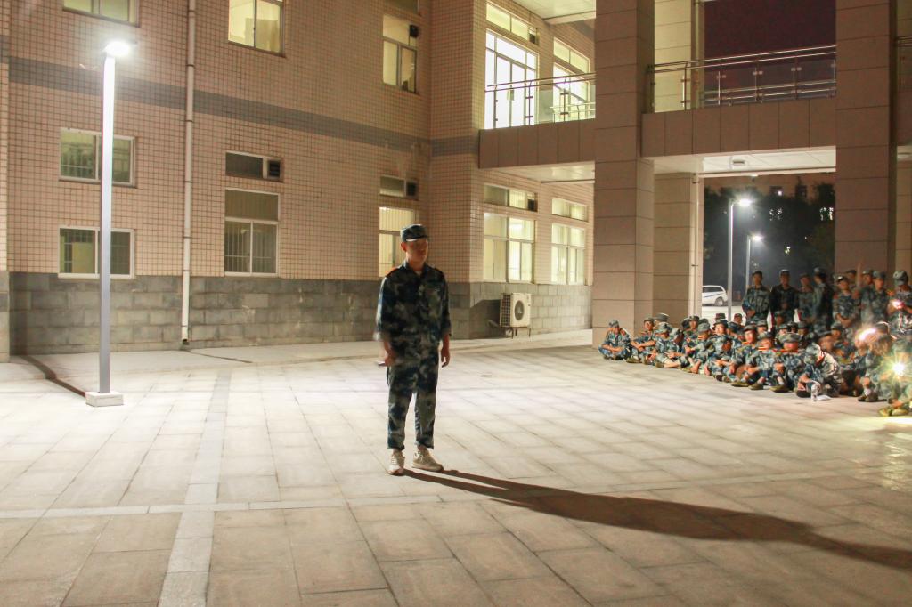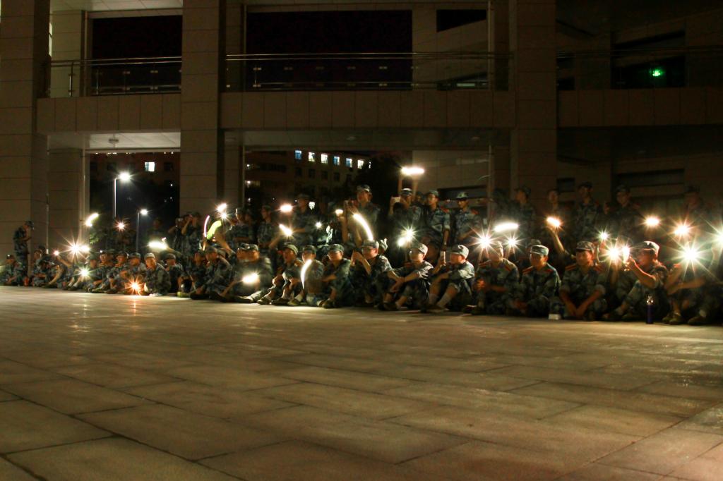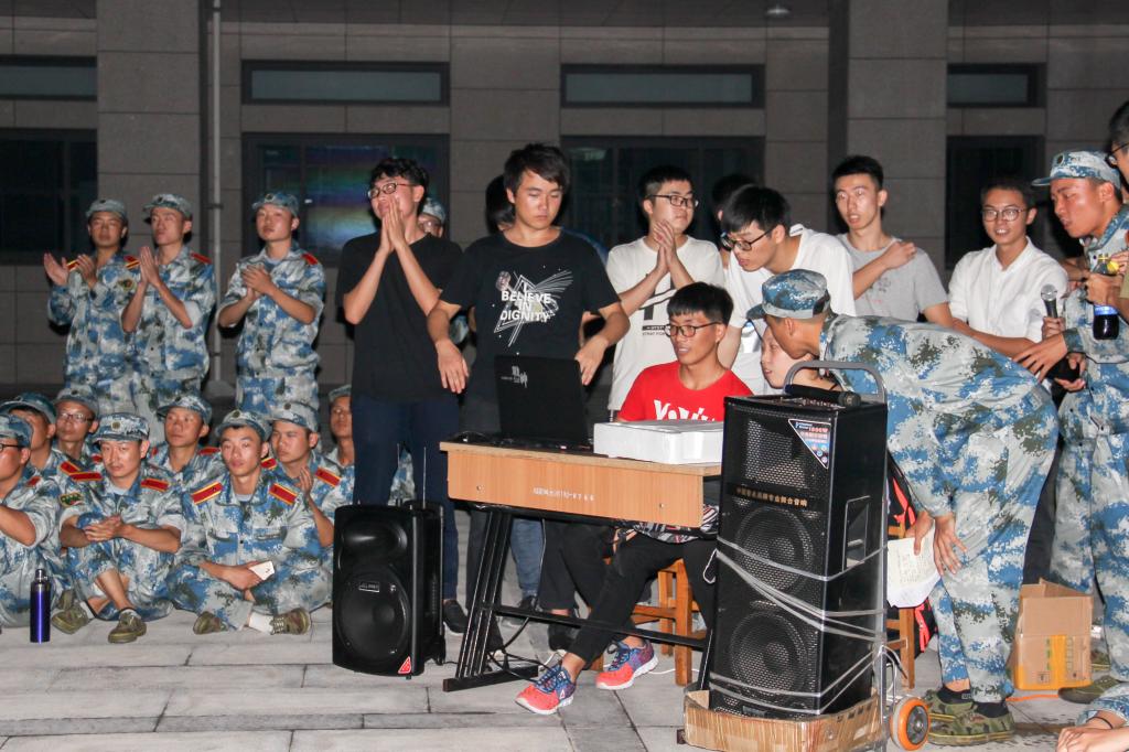 在秋风吹拂的夜晚,晚会的气氛因为节目的欢乐到达了高潮,不断地有同学自告奋勇的上台表演,现场的灯光闪烁犹如天边星,照在每个人的脸上,映出了最青春的笑容,军训虽累,但欢乐同在!