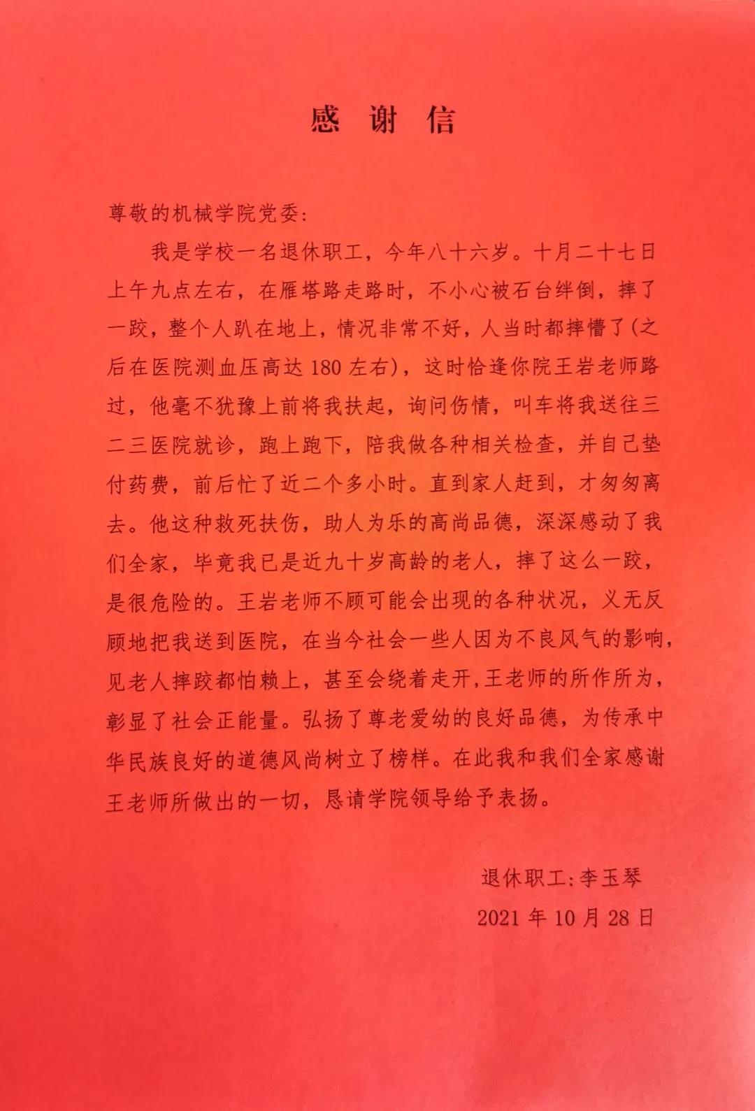 11月3日,滚球买球的app官网党委收到一封来自退休职工的感谢信。八十六岁高龄的李奶奶在信中讲述了滚球官网机械电子系青年教师王岩偶遇她不慎摔跤时给予无私帮助的前后经过。