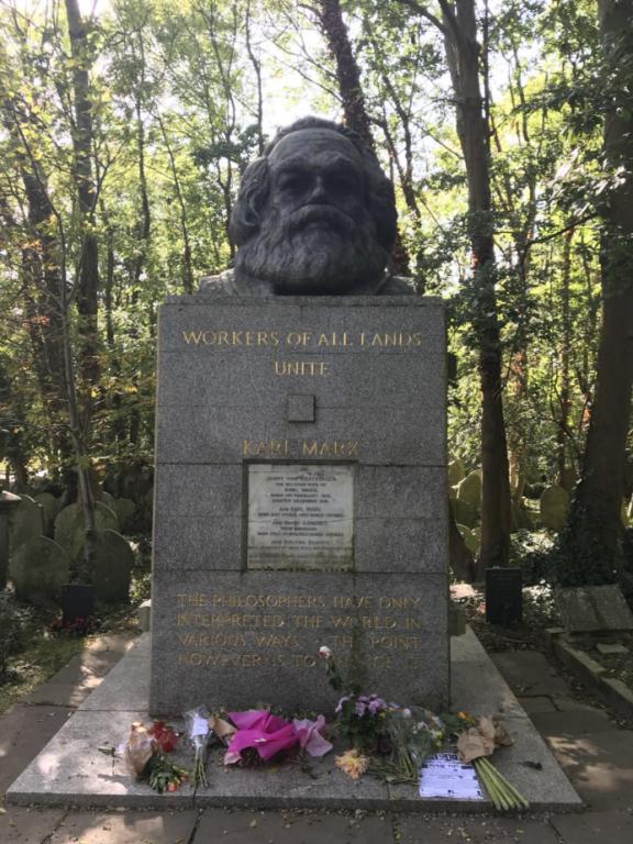 墓碑前放置着许多鲜花,眼前的马克思墓碑在经历了岁月的飘摇,依然庄严肃穆地矗立在这里,遥望远方,就如同我们相信共产主义终将到来。在墓碑下我们驻足仰视,献上了我们的崇敬,也留下了我们的怀念。在这个安静祥和的地方,我们从未与马克思这样近,肤色各异的人们纷纷驻足,瞻仰着马克思,似乎在告诉我们真正的伟人是不会被忘记的,他的学说和他的安息之地一样激励着人们直面困难,不断前行。